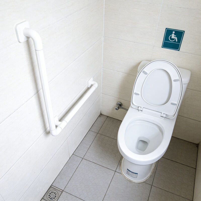 Seri pegangan toilet berbentuk U yang dipasang di lantai dengan kaki